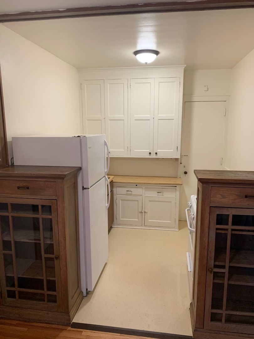 Large kitchen with original built ins.